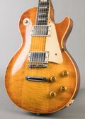 Originally a fully gold 1954 Les Paul Model, the guitar was refinished to a handsome cherry sunburst that eventually faded to its own unique hue. This refinish also brought light to the three piece maple top, which features a flamed middle piece that becomes even more eye catching when flanked by two more understated, authentic cuts. Fortunately, the person who repainted the instrument preserved the serial number on the back of the headstock in a way that helps it maintain its integrity and roots. Other aspects of the instrument were converted to 1959-type specs - reproduction tune-o-matic bridge, reproduction stop bar tailpiece, additional routing for T-Top humbuckers ("Gibson" embossed pickup covers included) and subsequently shaved pickguard - though the rear of the guitar maintains the darker finish associated with earlier Les Pauls as opposed to sunburst models. Additional modifications include a replaced nut, frets, tuners, knobs, strap buttons, jack plate, control cover (potentially signed by Les Paul), two pots, capacitors, switch tip, switch ring, third fret inlay, neck binding, and assorted screws. The original nut, knobs, capacitors, tuners, and additional mounting hardware are included in the mid 2000s hardshell Gibson case.