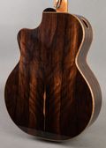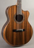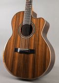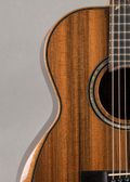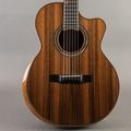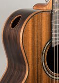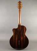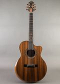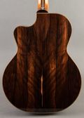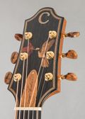 This 2010 Charis SJ Cutaway is built with a sinker redwood top and Malaysian blackwood back and sides, offering a warm, immediate response with a clear overtone structure. The redwood top brings a quick, open attack, while the blackwood adds depth and definition across the low and midrange. Its SJ body shape keeps the voice balanced, with a focused low end and articulate highs that remain controlled. The multi-piece neck construction combines mahogany, rosewood, and maple for added stability, paired with an ebony fingerboard featuring a trumpet vine inlay. Appointments include T’zalam binding and trim, a matching arm bevel, and a sound port, along with a Malaysian blackwood and abalone rosette. Gold Gotoh 510 tuners with custom T’zalam buttons round out the hardware.The soft cutaway provides extended upper fret access, and the overall build emphasizes clarity and separation across the strings. It stands as a detailed custom instrument with a cohesive blend of materials and design elements.