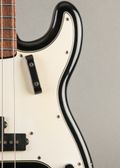 This 1965 Fender Precision Bass comes in a rare factory custom black finish and has held up impressively well over the decades. The body shows honest playwear—dings, light checking, and some edge wear—but nothing crazy for a nearly 60-year-old instrument. The original pickups and wiring harness are intact, delivering that classic, woody thump with a dry attack and plenty of presence. It’s had a professional refret and a new nut installed, both done cleanly and in keeping with the instrument’s original feel. A solid example of a mid-’60s P-Bass with a custom color and just the right amount of history on display.