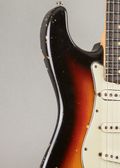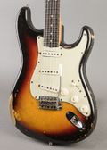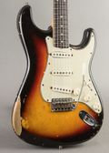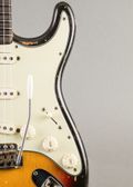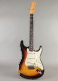This 1963 Fender Stratocaster in Sunburst shows significant, natural playwear, similar to a Custom Shop Heavy Relic. The finish has aged heavily in a way many players find appealing, and the neck is comfortably worn in, giving it an easy, familiar feel. It has had electronic modifications and a refret, but it still plays very well and delivers a classic, vintage-style Strat tone with clear highs and a smooth midrange. It’s a solid choice for someone prioritizing vintage feel and sound over originality.