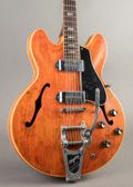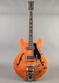 This 1967 Gibson ES-330 is a player grade beaut with a cool refinish almost akin to Grestch's Western Orange. It has the skinnier nut width common in late 60s Gibson spec, but still plays comfortably without it feeling overcrowded. The pots and ABR bridge have been replaced, but the Bigsby tailpiece is factory work. An all-in-all great player with true vintage vibe.