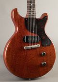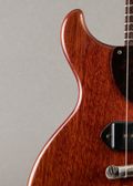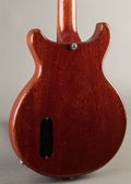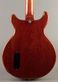 This 1959 Gibson Les Paul Junior in Cherry shows the kind of wear that comes from years of honest use, and it wears every mark well. The finish has faded and worn through in places, giving it a dry, broken-in look that matches the feel of the neck—smooth, fast, and comfortable. It’s been refretted and has a new nut, both done cleanly, making it play effortlessly up and down the board. The tuners have been replaced, and the volume pot is newer, with a bit of re-soldering visible in the control cavity. At one point, an aftermarket vibrato system was installed, but it’s since been removed, with the original tailpiece properly reinstalled—no structural issues, just the usual signs left behind.