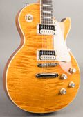 This 2024 Gibson Les Paul Standard in Honey Amber pairs a carved maple top with a mahogany body and set neck, producing a focused, mid-forward response with a tight low end and clear sustain. The honey amber finish highlights the top’s figure while keeping the overall look clean and understated. Notes carry plenty of sustain, with a smooth top end and controlled low frequencies.