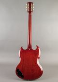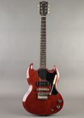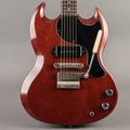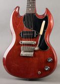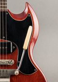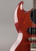 This 1965 Gibson SG Jr. in Cherry is a lightweight, no-frills solidbody with a direct and immediate response. The mahogany body and set neck construction produce a dry, focused tone with a strong midrange presence and a clear, biting top end. Its lone dog ear P-90 pickup  keeps the controls simple, emphasizing clarity and dynamic sensitivity.