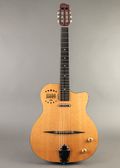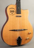 The Multiac Gypsy Jazz is a masterful fusion of tradition and innovation, bridging the timeless sound of classic Gypsy jazz with the versatility demanded by modern players. This model features a solid arched spruce top paired with a dual-chambered mahogany body, offering a rich, resonant tone with exceptional feedback resistance. It’s equipped with a custom L.R. Baggs electronic system and a Seymour Duncan Lipstick neck pickup, giving players a wide tonal palette. Independent top-mounted volume and tone controls provide easy on-the-fly adjustments, while the onboard L.R. Baggs Lyric microphone allows seamless blending with the primary signal for authentic, nuanced Gypsy jazz tones—at any volume. The guitar is completely original and in near-mint condition.