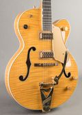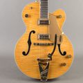 This Gretsch 6120 offers comfortable playability, versatile tone, and classic looks. The upgraded TV Jones pickups provide a clear, articulate take on the traditional Gretsch sound. Its C-shaped neck with minimal shoulder lends a subtle V-like feel, and the natural flame maple finish gives it a clean, understated appearance. Includes the original hard shell case.