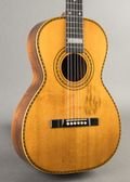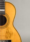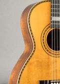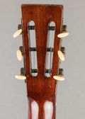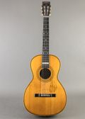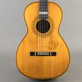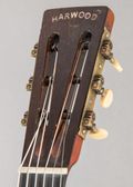 This 1920s Harwood parlor guitar features Brazilian rosewood back and sides paired with a full lacquer-refinish. Documented repairs include a neck reset, bridge reglue, a compression refret, and a patched area beneath the fingerboard extension. The A-string bridge hole has been plugged, and the bridge plate was previously filled and re-drilled for proper alignmen. A small patch sits under the fingerboard extension for stability. It is an excellent small-bodied piece with warm, subdued tone and excellent playability thanks to our recent repairs.