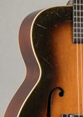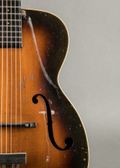 Cosmetically, it shows heavy wear and numerous defects, with evidence of a finish reaction across the top—likely related to the original pickguard—along with the kind of patina that only decades of use can create. The original pickguard is gone, though the original L-bracket remains in the case. There’s a nut shim, evidence of a previous neck set, and a shaved bridge. Structurally, however, the guitar is in very good and very original condition, so it feels solid in hand and ready to play, delivering a distinctive vintage archtop tone that stands apart from more common flat-tops.