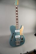 This Shelton T-style blends classic Jazzmaster electronics with Tele-style ergonomics. The Jazzmaster pickup configuration on a thinline Tele body yields a slightly fatter, offset-style voice while keeping the familiar T-style feel. It features a comfortable fat C neck profile and a lightweight semi-hollow body with a striking metal flake finish. Includes the original hard shell case and COA.